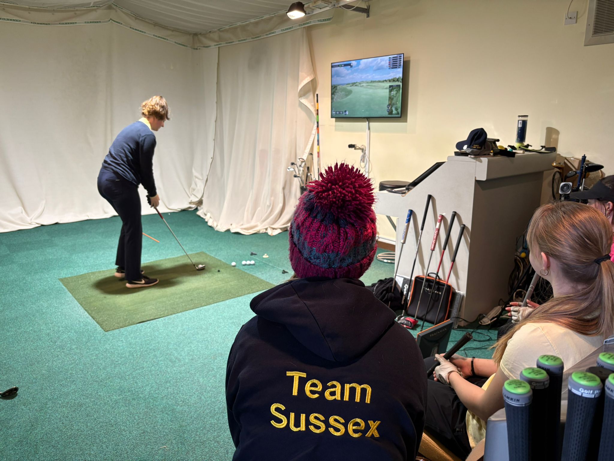 Good use was made of the excellent practice facilities at East Sussex National with 3 groups utilizing the indoor facilities. After 40 minutes, the groups rotated, allowing everyone to engage with the tasks presented. Jack Budgen, the coach, led a group in the studio with a nearest the pin challenge. Another group found themselves in the teaching bays warming up and hitting a range of shots. The final group carried out a putting exercise which needed precision and speed of thought. As the rain subsided, we ventured out onto the putting green for it only to “rain cats and dogs again”!